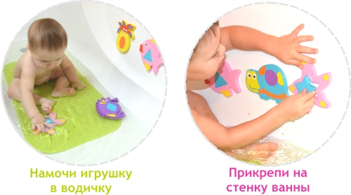 - достаточно просто окунуть аква-пазлы в воду и прикрепить на нужное место, а кроха будет их рассматривать пока купается